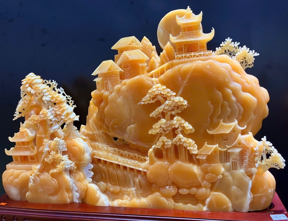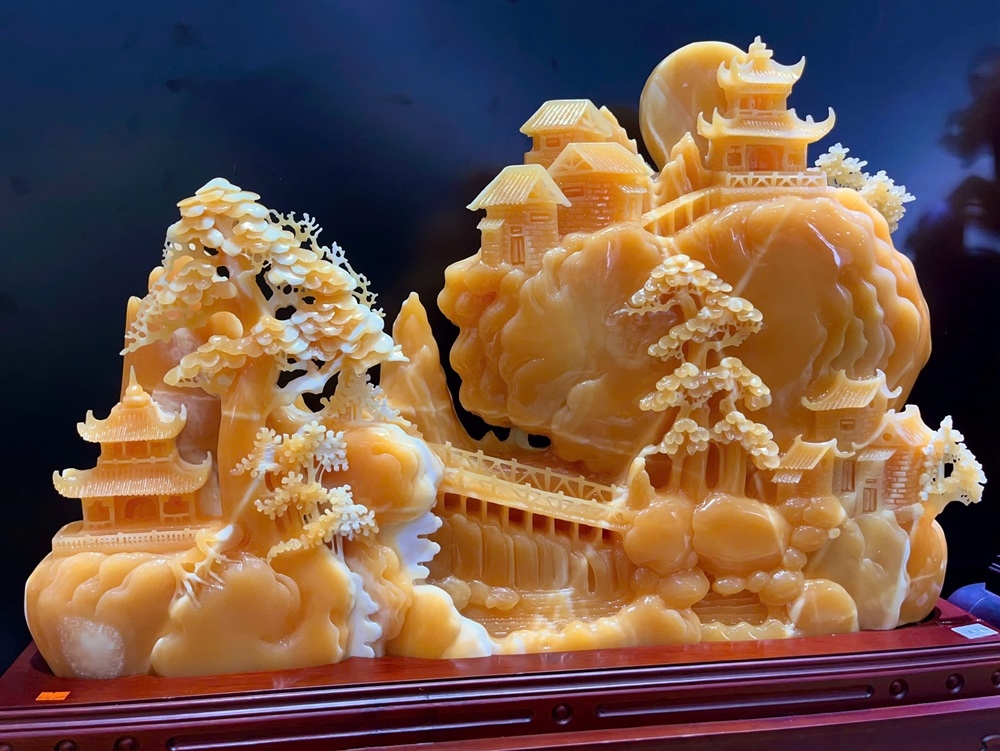 Tác phẩm Bồng Lai Tiên Cảnh bằng ngọc Hoàng Long là vật phẩm phong thủy cao cấp, tượng trưng cho sự trường thọ, bình an và thịnh vượng bền vững. Sự kết hợp giữa khung cảnh tiên giới (âm dương hòa hợp) và ngọc Hoàng Long màu vàng (chiêu tài lộc, trừ tà) giúp thu hút vượng khí, công danh sự nghiệp hanh thông, đồng thời mang lại sức khỏe và trí tuệ minh mẫn cho gia chủ.