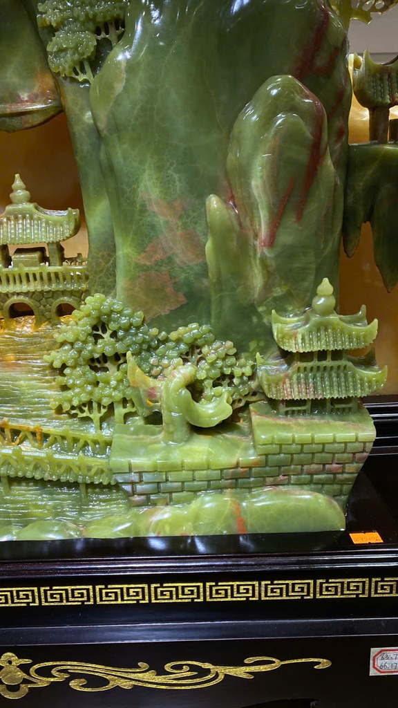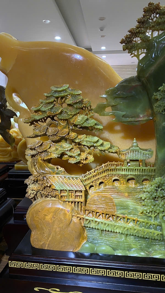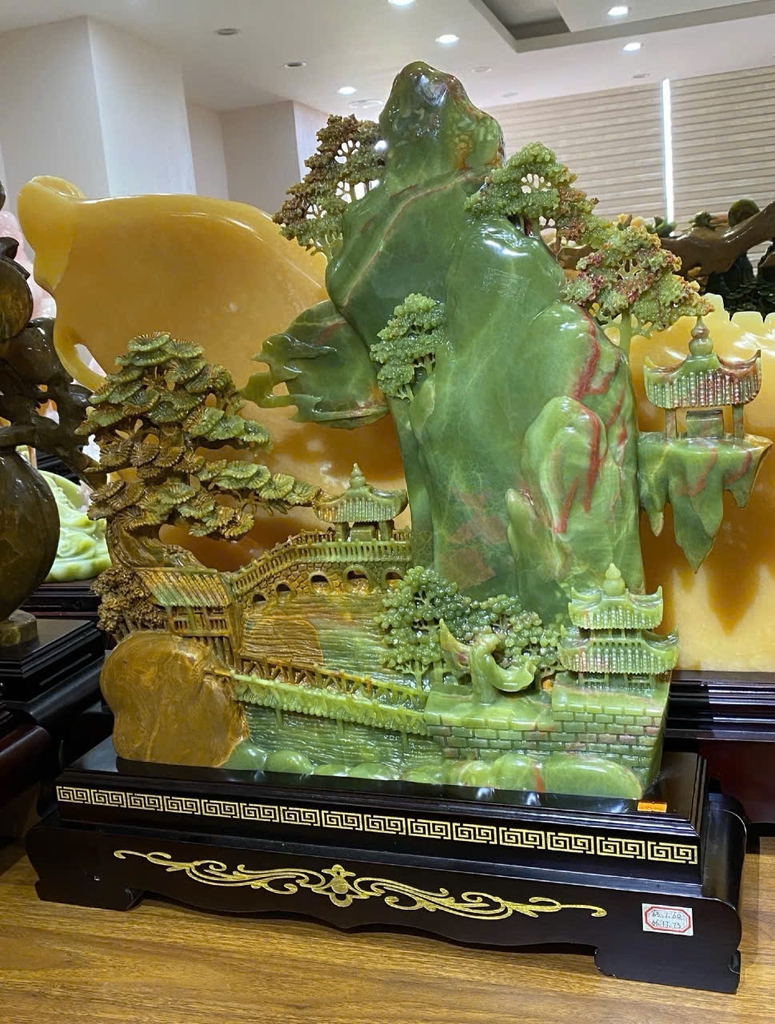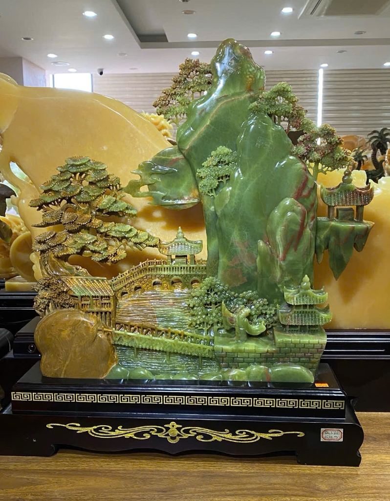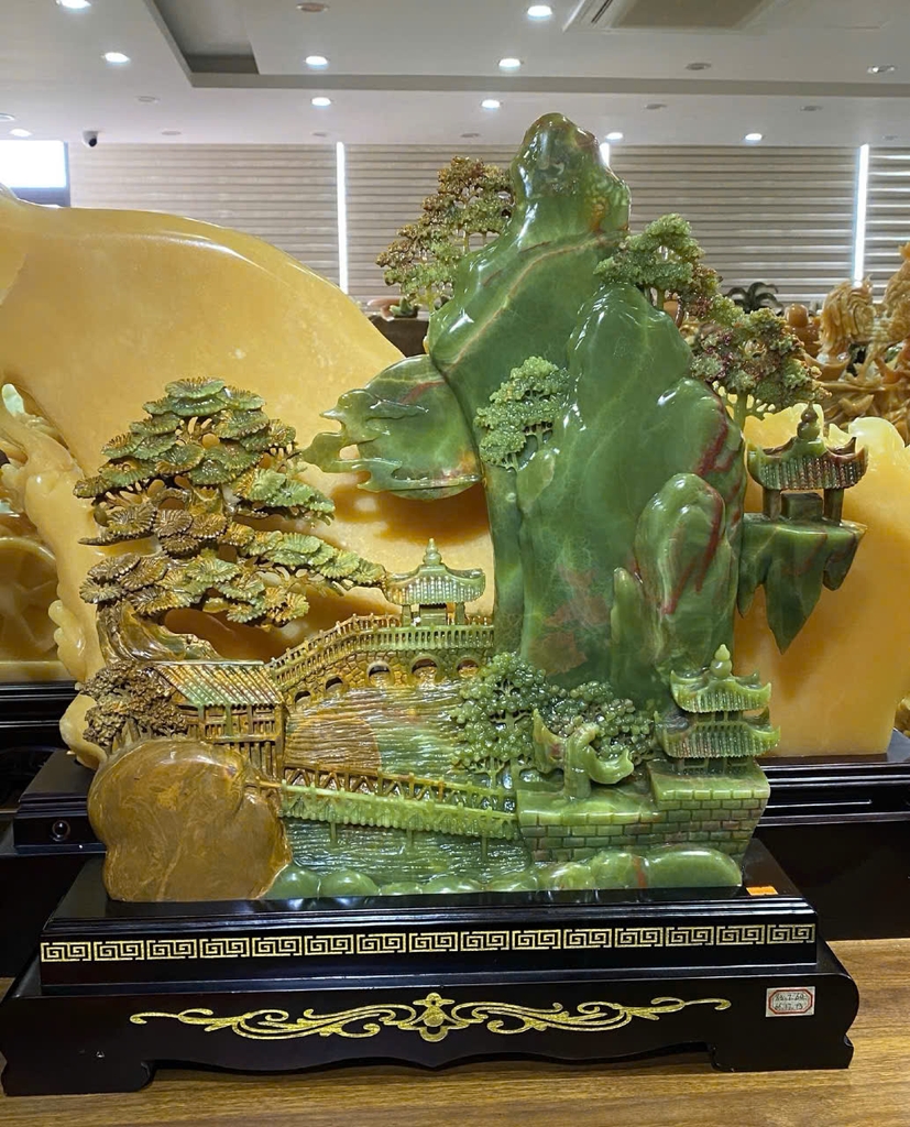 Bồng Lai Tiên Cảnh chế tác từ Ngọc Onyx Xanh là một tác phẩm phong thủy thượng hạng, mang vẻ đẹp hư ảo và năng lượng thanh khiết. Sự kết hợp giữa cảnh giới thần tiên và sắc xanh thấu quang của ngọc Onyx tạo nên ý nghĩa: "Thăng hoa sự nghiệp – Tâm thế an nhiên – Sức sống trường cửu".