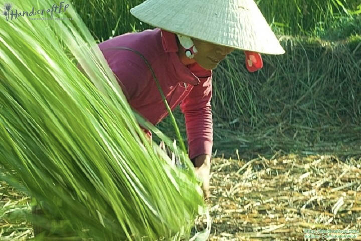 Sau khi được phơi khô ép đành sợi, cỏ bàng được bện thành đồ thủ công như giỏ, túi, tại HEP