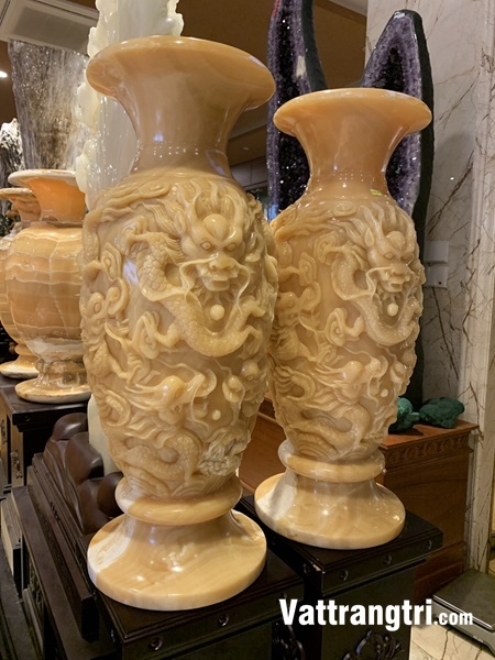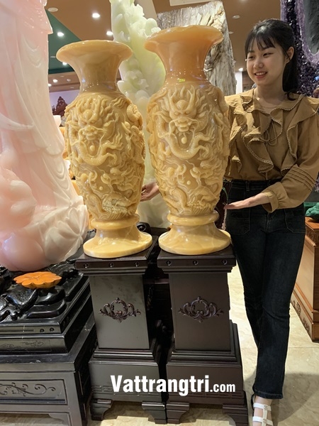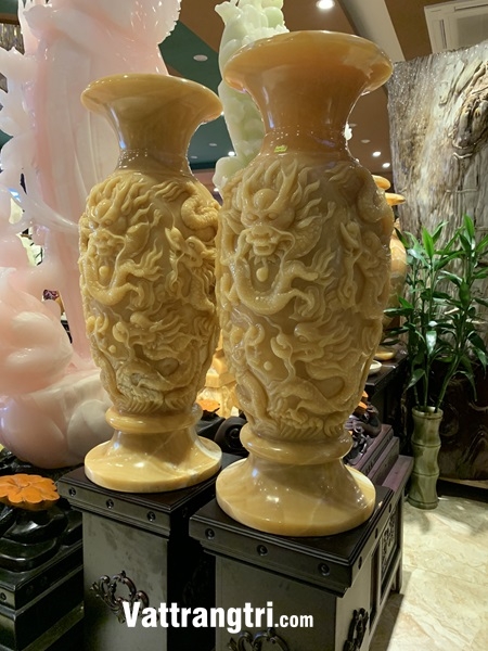 Cặp Lục Bình Chạm Khắc Cửu Long Ngọc Hoàng Long là sự kết hợp hoàn hảo giữa vẻ đẹp rực rỡ, quyền lực của ngọc hoàng long và hình tượng cửu long uy nghi. Ngọc hoàng long, với màu vàng rực rỡ, tượng trưng cho sự giàu sang, phú quý và những điều tốt lành. Cửu long, với hình tượng chín con rồng uốn lượn, tượng trưng cho sự quyền lực, sức mạnh và trường tồn. Lục bình, với hình dáng tròn trịa, tượng trưng cho sự sung túc, đủ đầy và bình an.