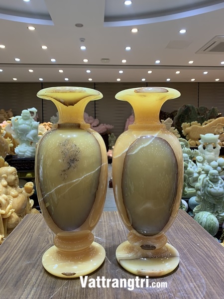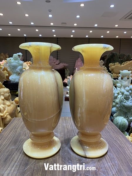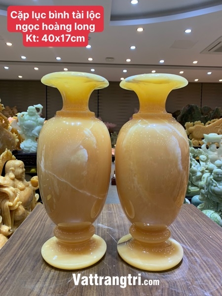 Cặp Lục Bình Tài Lộc này là sự kết hợp hoàn hảo giữa vẻ đẹp rực rỡ, quý phái của ngọc hoàng long và hình tượng lục bình truyền thống. Ngọc hoàng long, với màu vàng rực rỡ, tượng trưng cho sự giàu sang, phú quý và những điều tốt lành. Lục bình, với hình dáng tròn trịa, tượng trưng cho sự sung túc, đủ đầy và bình an.