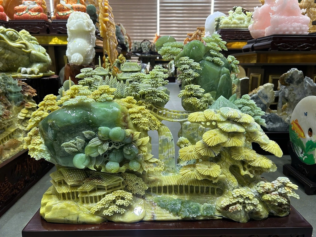 Hội tụ linh khí ngàn năm của dòng ngọc Tụ Nham quý hiếm, tác phẩm Bồng Lai Tiên Cảnh là biểu tượng tối thượng của vận may và sự bảo hộ. Hình ảnh tiên giới trùng điệp không chỉ tượng trưng cho sự giàu sang, mà còn tạo nên một thế trận phong thủy mạnh mẽ, giúp trấn trạch trừ tà, khơi thông dòng chảy tài lộc và mang lại sự hưng thịnh bền vững cho gia đạo.