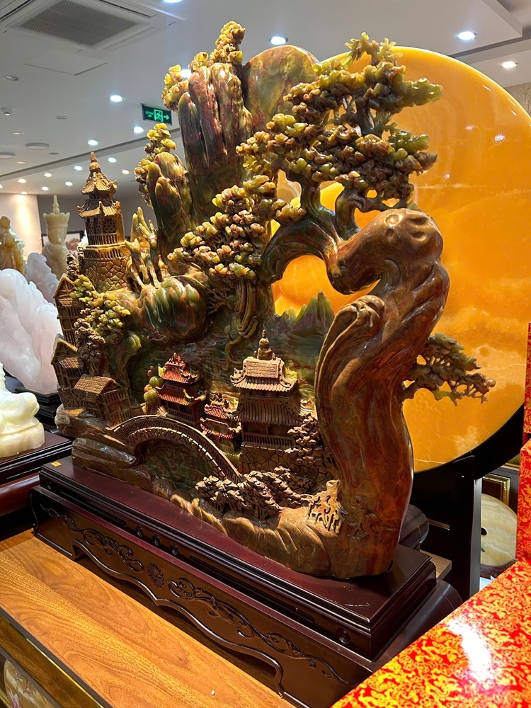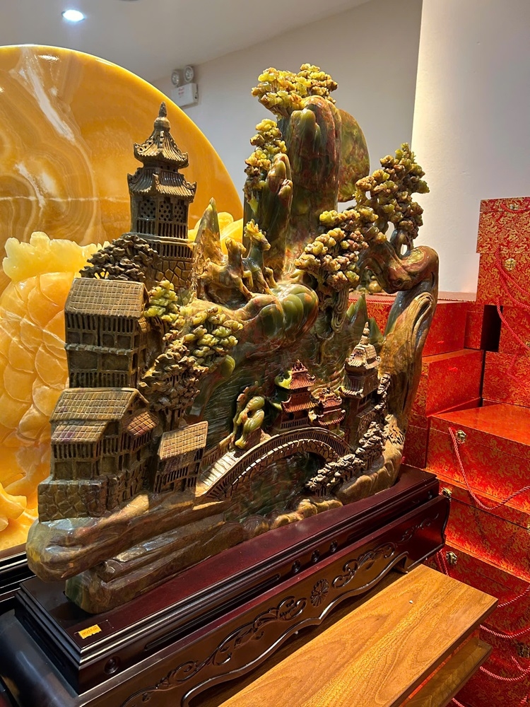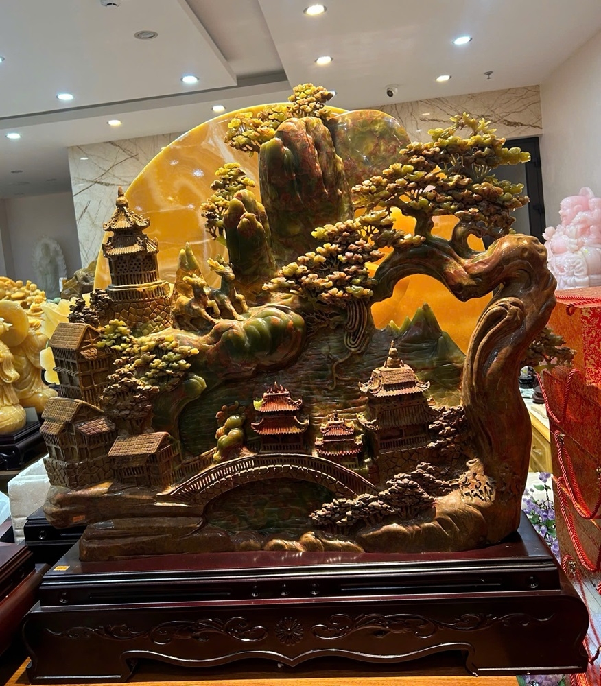 Tác phẩm tái hiện một thế giới huyền thoại với mây ngàn, núi biếc và lầu các, tượng trưng cho sự viên mãn về cả vật chất lẫn tinh thần. Khi được chế tác từ Ngọc Onyx với khả năng xuyên sáng huyền ảo, báu vật này giúp thanh lọc không gian, thu hút linh khí đất trời, mang lại sự trường thọ và vận trình hanh thông rực rỡ cho gia chủ.