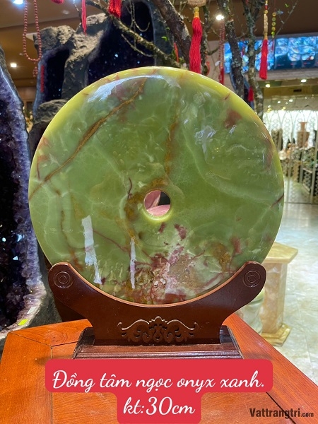 Kích thước nhỏ xinh, năng lượng an khang lan tỏa: Với đường kính 30cm, đồng điếu ngọc onyx xanh là điểm nhấn thanh lịch cho không gian, mang năng lượng an khang lan tỏa khắp không gian.