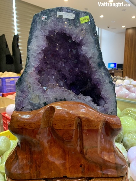 Vẻ đẹp tím ngọc thâm uyên từ lòng đất sâu thẳm: Hang động tinh thể thạch anh tím không chỉ là một vật phẩm trang trí, mà là một cánh cửa dẫn vào cõi tĩnh lặng, mang vẻ đẹp tím ngọc thâm uyên và năng lượng an lành sâu lắng. Bên ngoài là lớp vỏ đá xù xì, ẩn chứa bên trong một không gian huyền diệu với vô vàn tinh thể thạch anh tím đậm đà, lấp lánh như những vì sao trong đêm sâu, tượng trưng cho sự thức tỉnh tâm linh, sự khai mở trí tuệ và nguồn năng lượng chữa lành mạnh mẽ.