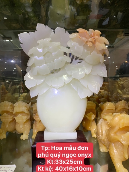 Vật phẩm Hoa Mẫu Đơn Phú Quý chế tác từ Ngọc Onyx là biểu tượng đỉnh cao của vẻ đẹp quyền quý, sự giàu sang và hạnh phúc viên mãn. Trong phong thủy, sự kết hợp giữa "Quốc sắc thiên hương" và dòng ngọc thấu quang Onyx mang lại nguồn năng lượng tích cực rất mạnh mẽ.