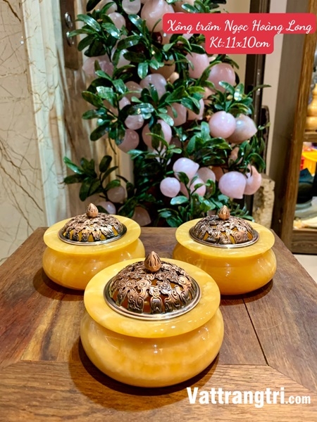 Lư Xông Trầm này là sự kết hợp hoàn hảo giữa vẻ đẹp rực rỡ, quý phái của ngọc hoàng long và hình tượng lư xông trầm truyền thống. Ngọc hoàng long, với màu vàng rực rỡ, tượng trưng cho sự giàu sang, phú quý và những điều tốt lành. Lư xông trầm, với hình dáng truyền thống, tượng trưng cho sự thanh tịnh, trang nghiêm và những điều tốt lành.