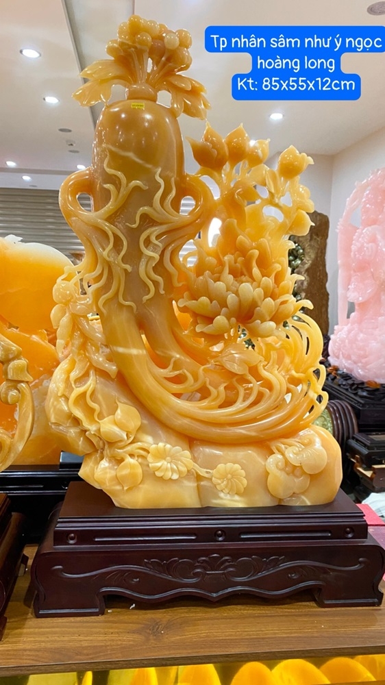 Nhân Sâm Như Ý chế tác từ Ngọc Hoàng Long là sự kết hợp độc đáo giữa biểu tượng của sức khỏe trường thọ và quyền năng vạn sự thuận lợi. Trong phong thủy, tác phẩm này mang ý nghĩa tổng hòa: "Thân thể bách niên - Sự nghiệp như ý - Tài lộc vững bền".