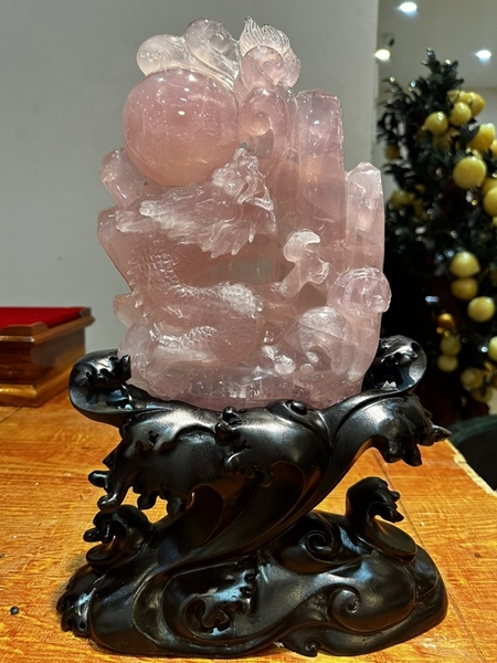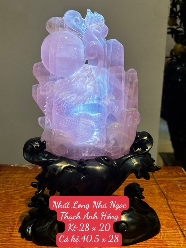 Tác phẩm "Nhất Long Nhả Ngọc" là một tuyệt phẩm phong thủy được điêu khắc tinh xảo từ khối Thạch Anh Hồng Trong (Rose Quartz) tự nhiên. Hình tượng Rồng uy nghiêm, mạnh mẽ đang ngậm viên ngọc quý. Màu hồng dịu dàng, trong suốt đặc trưng của Thạch Anh Hồng không chỉ mang lại vẻ đẹp tinh tế, lãng mạn mà còn chứa đựng nguồn năng lượng tích cực của Tình Yêu, Hạnh Phúc và sự Bình An.