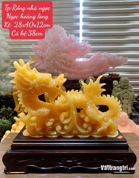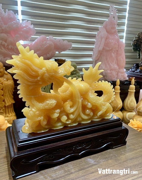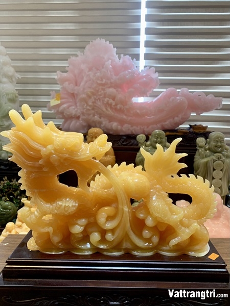 Tác phẩm Rồng Nhả Ngọc này là sự kết hợp hoàn hảo giữa vẻ đẹp tinh xảo, uy nghi của hình tượng rồng và vẻ đẹp quý phái, rực rỡ của ngọc hoàng long. Rồng, với hình dáng mạnh mẽ, uy dũng, tượng trưng cho sức mạnh, quyền lực và sự thành công. Ngọc hoàng long, với màu vàng tươi tắn, mang đến cảm giác ấm áp, thịnh vượng và sung túc.
