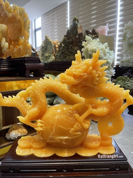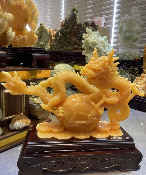 - Chất liệu: Được chế tác từ ngọc hoàng long tự nhiên, mang đến vẻ đẹp sang trọng và bền bỉ. Màu sắc của ngọc hoàng long thường vàng óng ánh, tượng trưng cho sự giàu có và quyền lực.