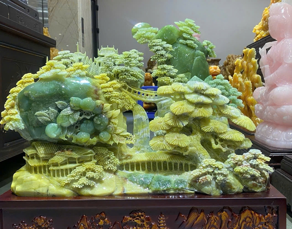 Phong cảnh hữu tình chế tác từ ngọc Serpentine không chỉ là một khối đá quý đơn thuần, mà là một bức tranh thiên nhiên sống động, hội tụ tinh hoa của đất trời để mang lại sự cân bằng tuyệt đối cho không gian sống. Trong phong thủy, tác phẩm này đại diện cho triết lý "Thiên thời - Địa lợi - Nhân hòa", là biểu tượng của sự thịnh vượng bền vững và tâm thế an nhiên.