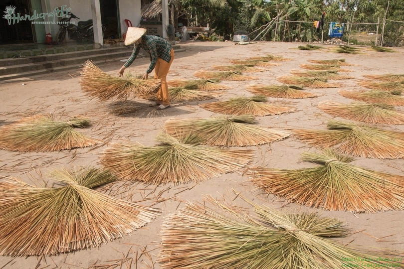 Khoảng sân rộng phía trước là nơi dùng để phơi những bó cỏ bàng mà chị vừa mới đi thu hoạch về. Chị Xêm kể, hằng ngày chị phải dậy từ rất sớm để đi nhổ cỏ bàng, tới tầm 9-10h sáng thì mang về và phơi ngoài sân khoảng 2-3 ngày cho khô. Chị Xêm cho biết việc nhổ cỏ cũng phải đúng cách nếu không sẽ bị đứt gốc, hay bị dập thân cỏ, sợi cỏ bàng sẽ không đều nhau.