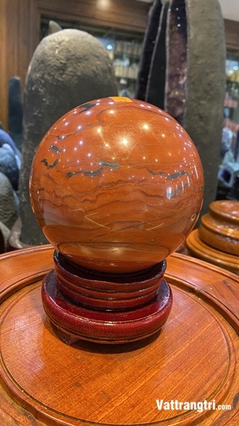 Vẻ đẹp hỏa ngọc từ lòng đất sâu thẳm: Quả cầu ngọc bích đỏ 13cm không chỉ là một vật phẩm trang trí, mà là một chứng tích của tự nhiên, mang vẻ đẹp hỏa ngọc rực rỡ và năng lượng chinh phục vô song. Sắc đỏ rực lửa như dung nham núi lửa, những lớp vân đá độc đáo như dòng chảy lửa đỏ, tượng trưng cho sức mạnh, đam mê và ý chí chinh phục.