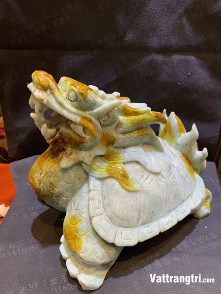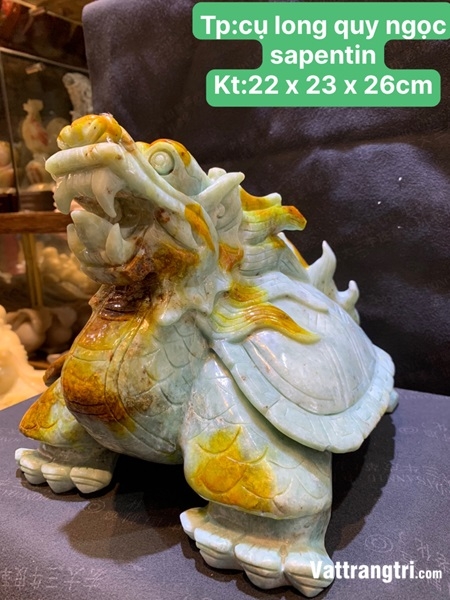 Tác Phẩm Cụ Long Quy này là sự kết hợp hoàn hảo giữa vẻ đẹp uy nghi, dũng mãnh của hình tượng long quy và vẻ đẹp độc đáo, huyền ảo của ngọc serpentine. Long quy, với hình dáng kết hợp giữa rồng và rùa, tượng trưng cho sự trường thọ, sức mạnh và những điều tốt lành. Ngọc serpentine, với những đường vân độc đáo, mang đến cảm giác bình yên, thư thái và đầy sức sống.