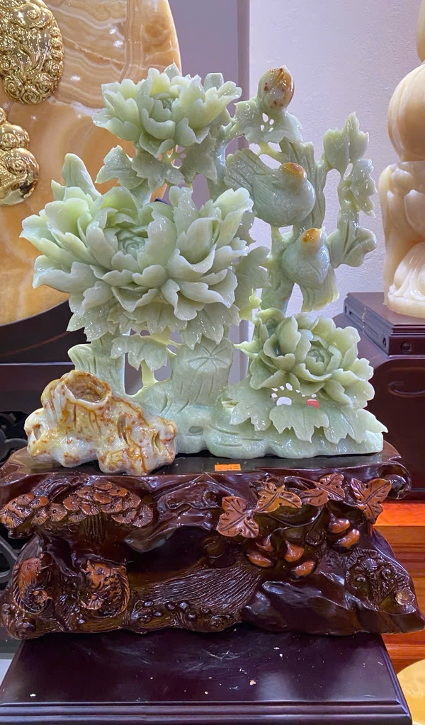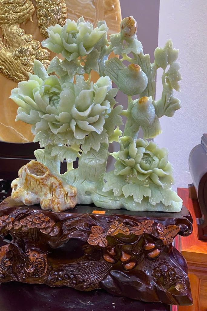 Được mệnh danh là "Quốc sắc thiên hương", hoa Mẫu Đơn đại diện cho vẻ đẹp cao quý và sự thịnh vượng về tài lộc. Khi được tạc trên nền Ngọc Serpentine – dòng đá mang năng lượng của sự sinh sôi và tươi mới – tác phẩm không chỉ giúp thu hút duyên lành, hâm nóng tình cảm gia đình mà còn là "thỏi nam châm" chiêu tài tiến bảo, khẳng định vị thế uy nghiêm của chủ nhân.
