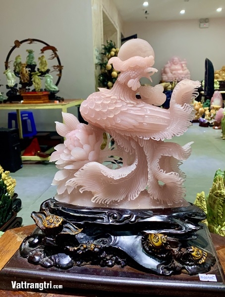 Hình tượng chim khổng tước và hoa mẫu đơn, với ý nghĩa phong thủy sâu sắc, từ lâu đã được coi là biểu tượng của sự giàu sang, phú quý, quyền quý và những điều tốt lành. Thạch anh hồng, với khả năng mang lại tình duyên và may mắn, giúp gia chủ luôn gặp những điều tốt lành. Sự kết hợp giữa hình tượng chim khổng tước, hoa mẫu đơn và thạch anh hồng tạo nên một tác phẩm phong thủy giá trị, mang đến những điều tốt lành cho gia chủ.
