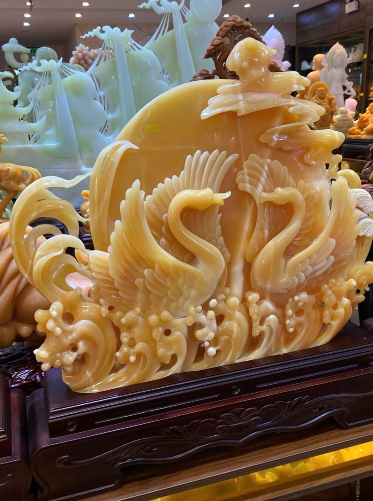 Tác phẩm Thiên Nga Phu Thê Viên Mãn Ngọc Hoàng Long không đơn thuần là một vật phẩm trang trí, mà là một bản giao hưởng ngọt ngào về tình yêu và sự thịnh vượng. Được tạc từ khối ngọc mang sắc vàng quyền quý của cung đình, hình tượng đôi thiên nga kiêu sa quấn quýt bên nhau như một lời khẳng định về tình nghĩa phu thê sắt son, bền chặt qua năm tháng. Đây là sự kết hợp tinh tế giữa linh khí của đất trời và khát vọng về một đời sống viên mãn, nơi hạnh phúc lứa đôi và dòng chảy tài lộc luôn song hành, nảy nở.