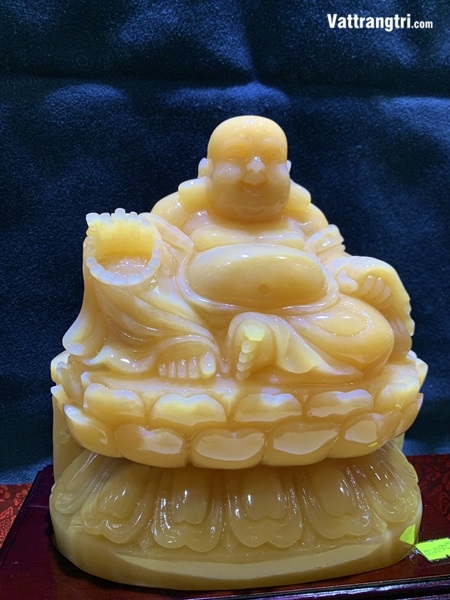 Ngắm nhìn tượng Thần Tài Di Lặc tạc từ Ngọc Hoàng Long quý hiếm, kích thước khoảng 20 x 22cm, ta cảm nhận sự tươi vui và an lành lan tỏa từ nụ cười bất tận. Bụng Ngài tròn đầy như chứa đựng mọi điều tốt đẹp, dáng vẻ thư thái như gieo vào lòng người niềm tin và hy vọng về một cuộc sống an yên, đủ đầy.