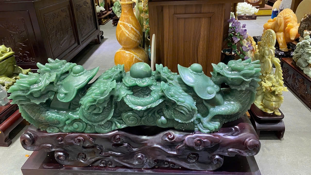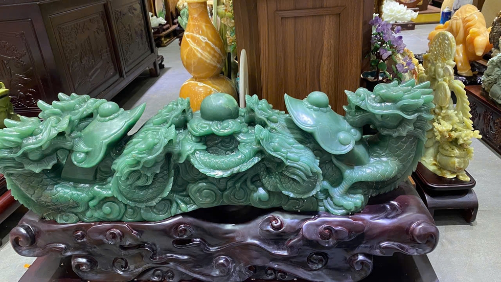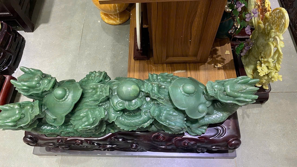 Vật phẩm này là sự kết hợp quyền năng giữa hình dáng Vương trượng (Gậy Như Ý) - biểu tượng của sự toại nguyện, và hình ảnh Cửu Long (9 con rồng) - đại diện cho đỉnh cao của quyền lực hoàng gia và sự trường tồn. Khi được tạc trên nền Thạch Anh Xanh loại đá của cơ hội và sự thịnh vượng – tác phẩm không chỉ giúp củng cố địa vị, hóa giải tiểu nhân mà còn mang lại nguồn năng lượng tươi mới, giúp chủ nhân luôn sáng suốt và thu hút những vận may lớn trong sự nghiệp.