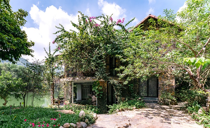 Mặt tiền ngôi nhà được ốp đá rối, bao phủ bởi giàn hoa giấy để tạo vẻ thô mộc, trái ngược với không gian hiện đại bên trong.