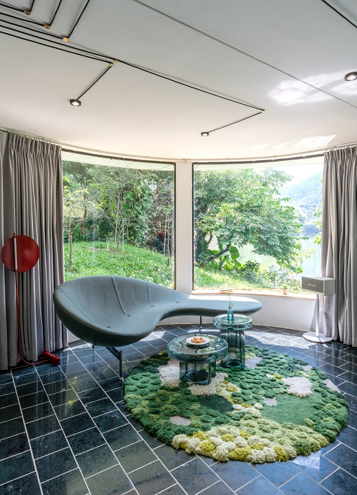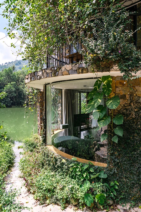 Mặt tiền ngôi nhà được ốp đá rối, trồng các giống cây dây leo và hoa giấy để giảm hấp thụ nhiệt vào không gian bên trong nhà. Tầng một luôn tràn ngập ánh sáng tự nhiên nhờ những ô cửa kính cong diện tích lớn, hướng tầm nhìn ra hồ nước và sân vườn.