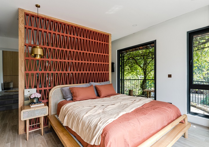 Giường tại phòng ngủ chính hướng ra cảnh quan mặt hồ. Góc ban công được bố trí mái hiên che mưa nắng, trồng cây dây leo bao phủ khắp phần lan can để tăng mảng xanh.