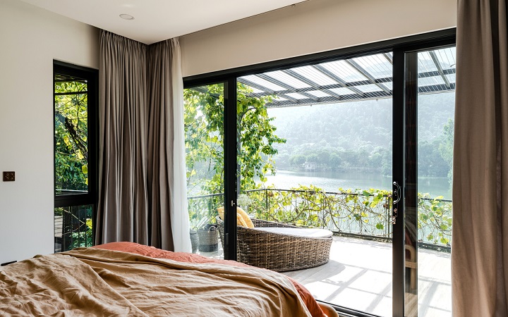 Phòng ngủ chính có hai ban công, ngăn cách với không gian bên ngoài bằng cửa kính và rèm.