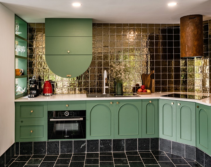Không gian bếp được bày trí hiện đại với các mảng tường cong ốp gạch tone màu ánh kim loại, hút mùi có hình trụ tròn màu nâu đất.