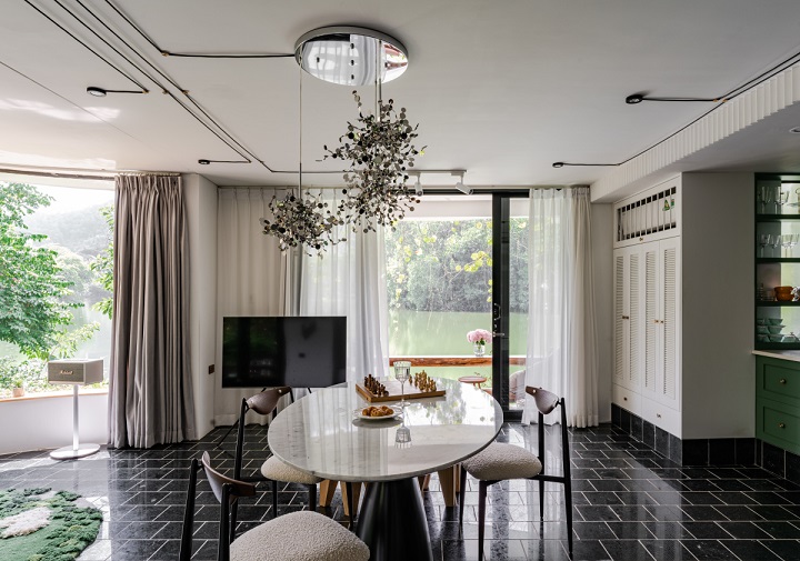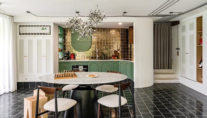 Phòng bếp, ăn liên thông với khu tiếp khách nhằm giúp gia tăng sự kết nối, tương tác. Tủ lạnh và các vật dụng nấu nướng được khéo léo che đi bởi hệ tủ.