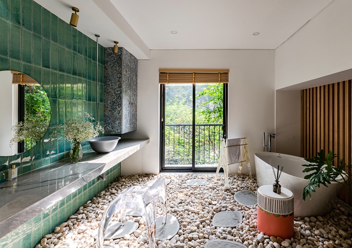 Phòng vệ sinh có nền rải sỏi, bố trí bồn tắm nằm để tăng tính thư giãn như không gian nghỉ dưỡng.