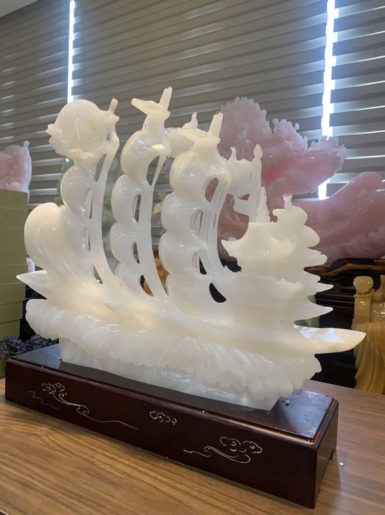 Thuận Buồm Xuôi Gió chế tác từ Bạch Ngọc Onyx trắng là một trong những tác phẩm phong thủy hội tụ vẻ đẹp thanh tao và sức mạnh bổ trợ sự nghiệp. Sự kết hợp giữa biểu tượng con thuyền vượt sóng và dòng ngọc thấu quang trắng mang ý nghĩa: "Vạn sự hanh thông – Tiền tài rộng mở – Trí tuệ tinh khôi"