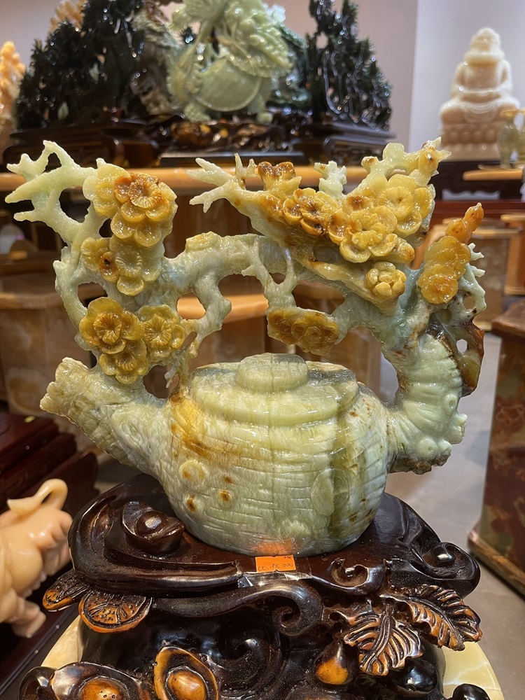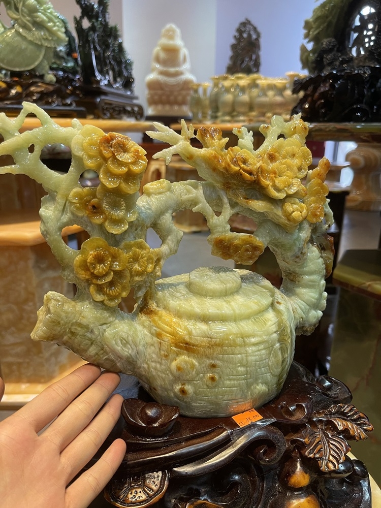 Bình ấm trà hoa Tài lộc Ngọc Tụ Nham là vật phẩm kết hợp giữa ngọc tự nhiên và chế tác thủ công, mang ý nghĩa thu hút tài lộc, tích tụ thịnh vượng và gia tăng sự thịnh vượng. Ngọc Tụ Nham (dòng Nephrite) tượng trưng cho quyền quý, sức khỏe và bình an, giúp trấn trạch, hóa giải sát khí và mang lại may mắn.