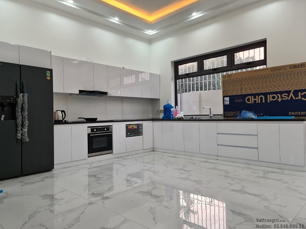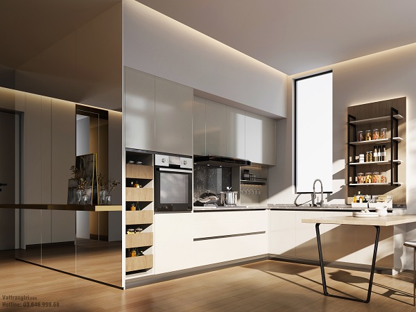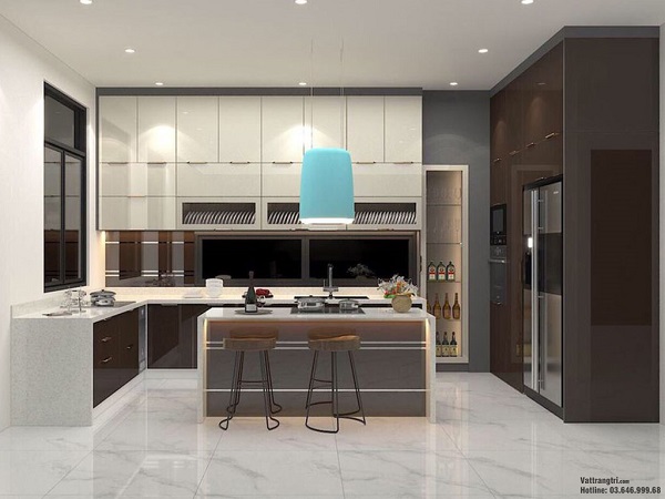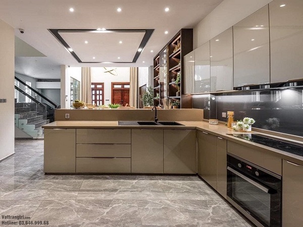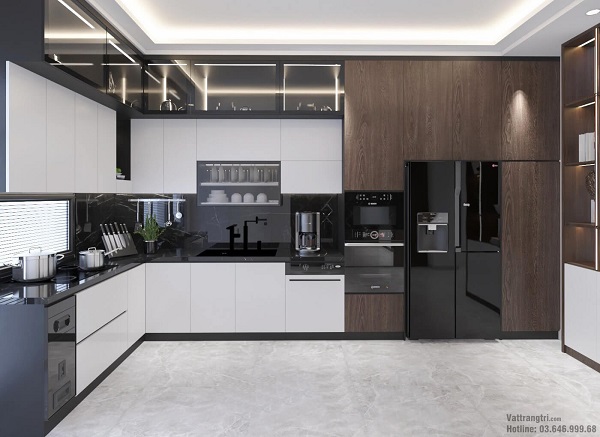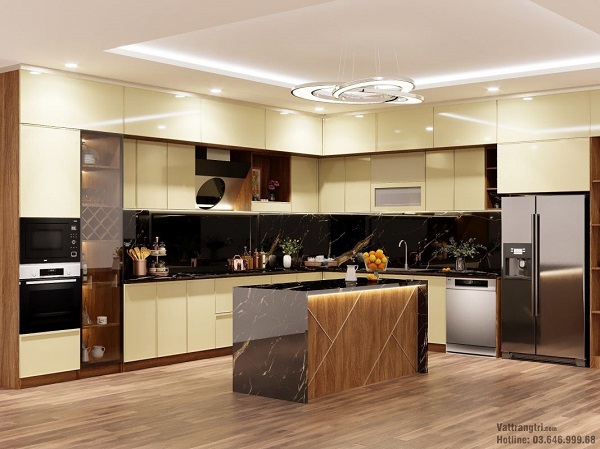 - Với không gian bếp có diện tích lớn thì ta có thể lắp thêm các thiết bị như lò nướng, lò vi sóng, máy hút mùi, máy rửa chén, tủ khô hoặc tủ đông liền kề 2 cạnh tủ bếp.