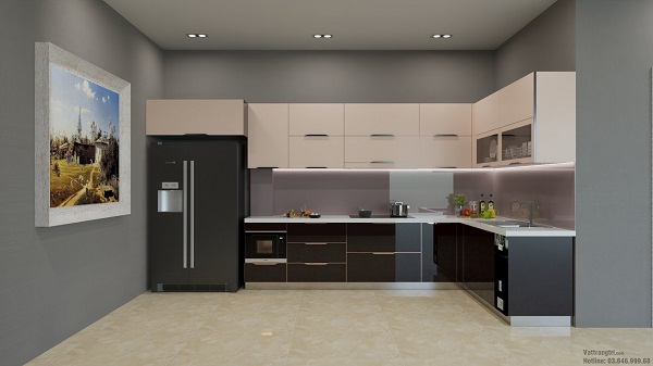 - Khác với tủ bếp chữ i hay tủ bếp chữ u, nhờ thiết kế hai cạnh ôm sát theo mặt tường tạo thành một góc vuông hình chữ L ôm trọn góc nhà bếp giúp tối ưu không gian công năng cho tủ bếp.