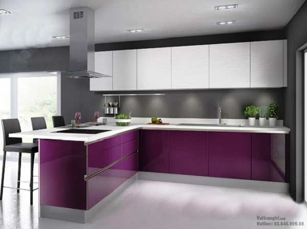 Tủ bếp chữ L thùng gỗ sồi cánh gỗ mdf tím