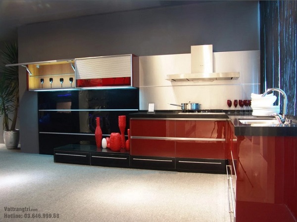 Tủ bếp chữ L thùng inox modun cánh kính đỏ