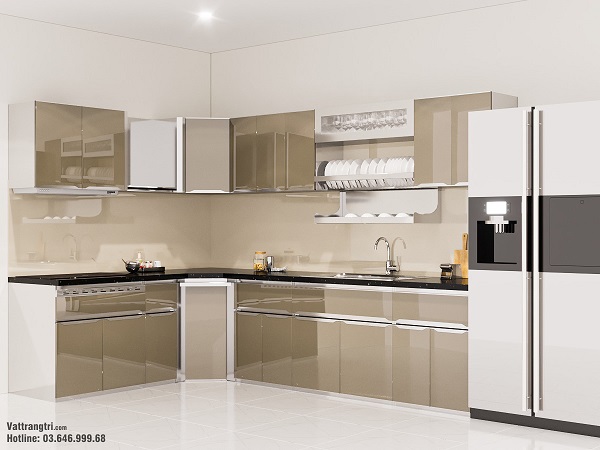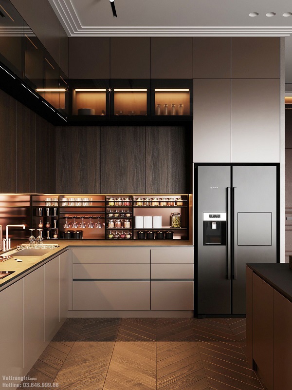 Tủ bếp chữ L cánh kính màu cafe được thiết kế tối ưu không gian