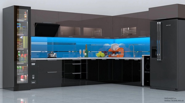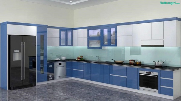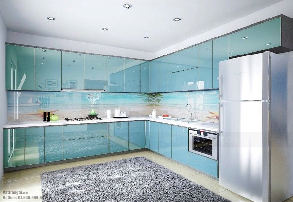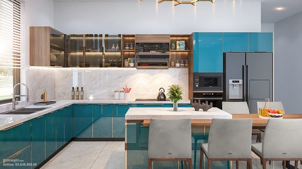 Tủ bếp chữ L thùng gỗ mdf chống ẩm cánh kính xanh dương