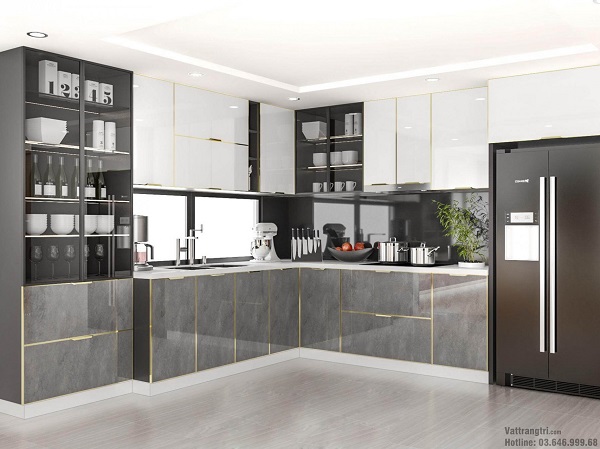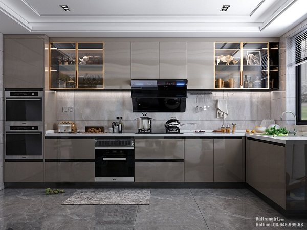 Kích thước tủ bếp chữ L cánh kính tiêu chuẩn