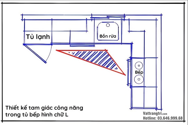 Thông thường, quy trình của một người nội trợ khi bước vào bếp sẽ là: lấy nguyên liệu từ tủ lạnh – rửa và sơ chế nguyên liệu tại khu vực bồn rửa – sau đó nấu chín tại khu vực bếp nấu. Việc sắp xếp tam giác công năng trên tủ bếp chữ L như trên nhằm tạo không gian đủ cho người nội trợ chuẩn bị và sơ chế nguyên liệu trước khi nấu.