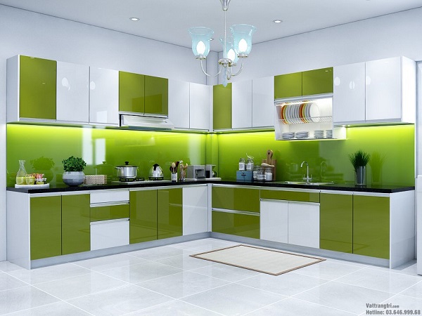 Tủ bếp chữ L thùng gỗ mdf chống ẩm cánh kính xanh lục đậm
